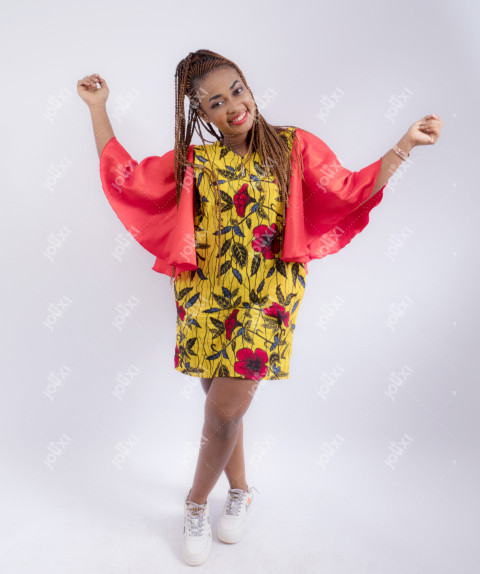 Jeune femme africaine souriante en tenue traditionnelle dansant sur un fond beige