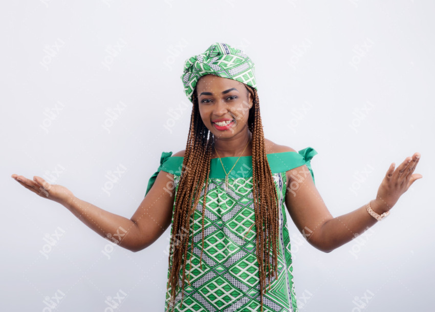Jeune femme africaine souriante en tenue traditionnelle montrant sa paume sur un fond blanc