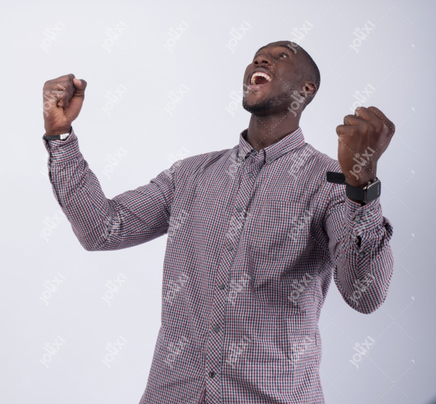 Jeune homme africain célébrant sa victoire sur un fond rouge