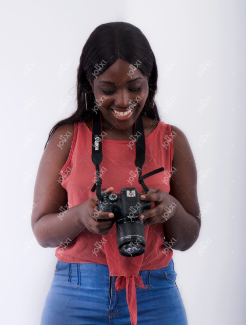 Jeune femme africaine souriante se faisant un selfie sur un fond blanc