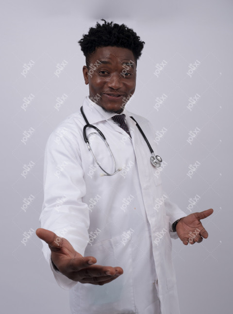 Un médecin montrant ses mains pour accueillir ayant un stéthoscope
