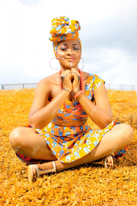 Femme africaine souriante dansant en tenue traditionnelle sur un fond beige
