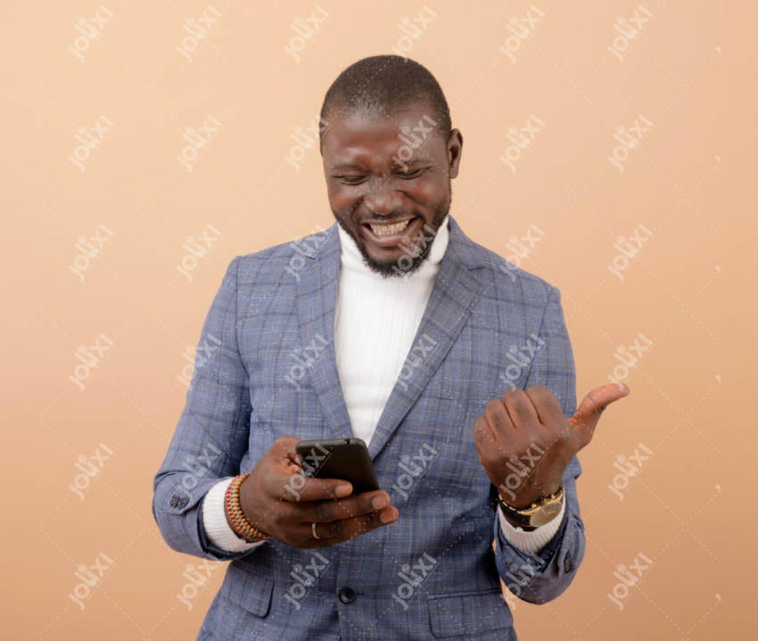 Un homme africain en costume célébrant sa victoire ayant son smartphone en main