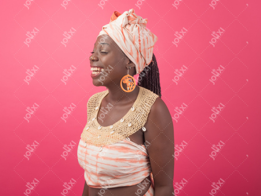 Une femme africaine en tenue traditionnelle fermant ses yeux en souriant