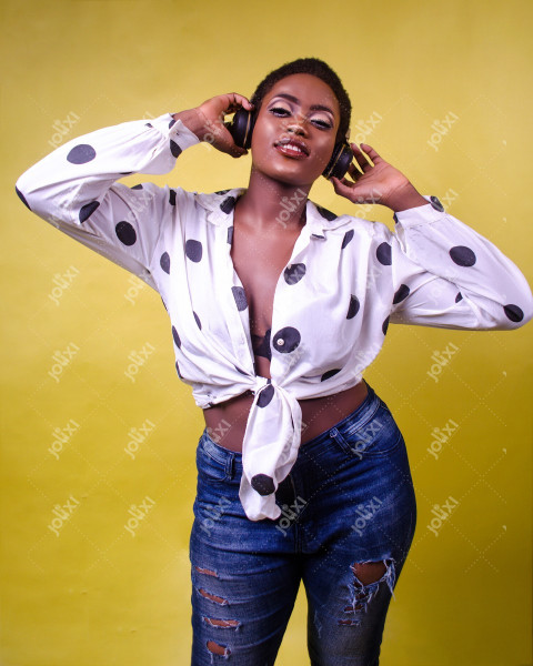 Belle femme africaine en joie dans une tenue traditionnelle dansant sur un fond beige