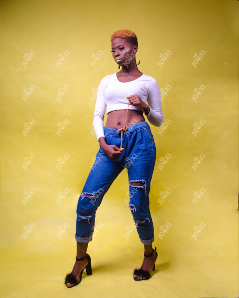 Femme africaine souriante en tenue traditionnelle dansant sur un fond beige