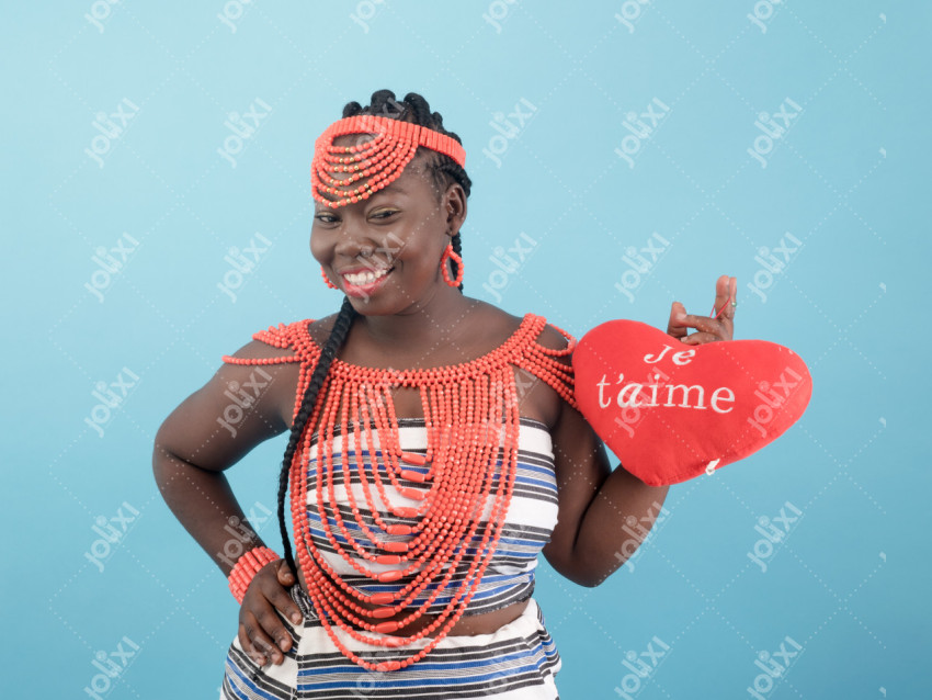 Jeune fille africaine en tenue traditionnelle souriante avec un cœur sur un fond bleu