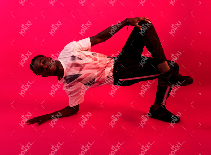 Jeune danseur africain soulevant ses jambes sur un fond rose