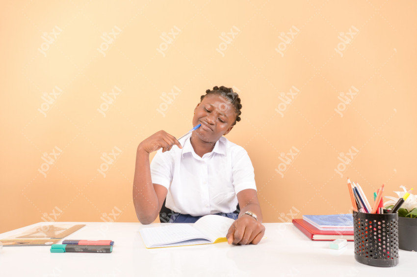Une écolière africaine en tenue scolaire assise en classe regardant son crayon