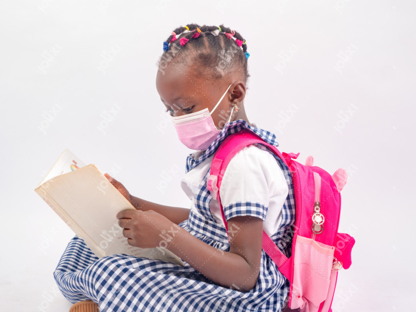 Une écolière africaine assise portant un masque de protection tenant son cahier sur un fond blanc