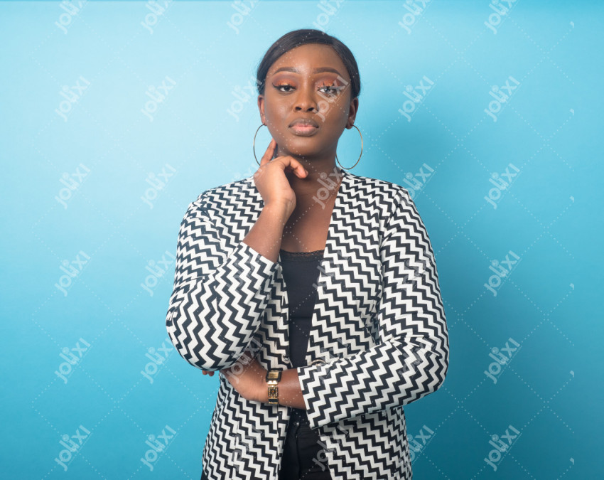 Femme africaine en veste contente touchant son menton sur un fond blanc