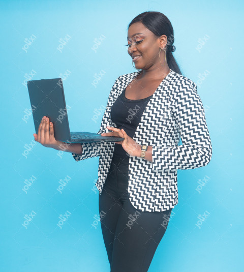 Jeune femme africaine en costume souriante manipulant son ordinateur sur un fond bleu