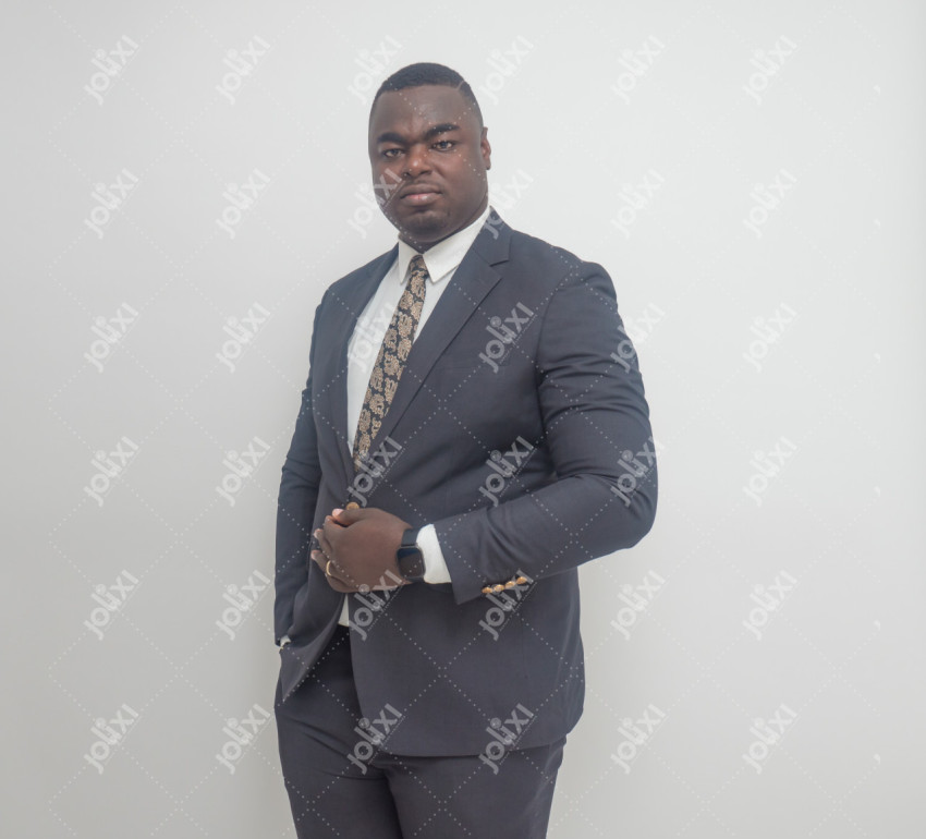 Homme d'affaire africain en veste souriant sur un fond gris