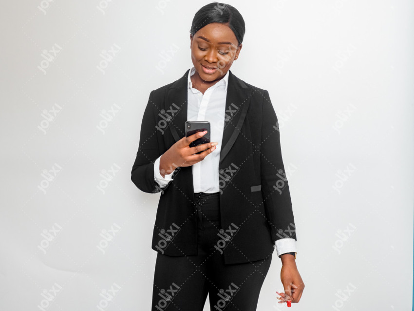 Femme africaine souriante tenant son smartphone sur un fond blanc