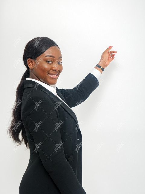 Femme africaine en tailleur souriante avec des longs mèches indicant sur un fond blanc