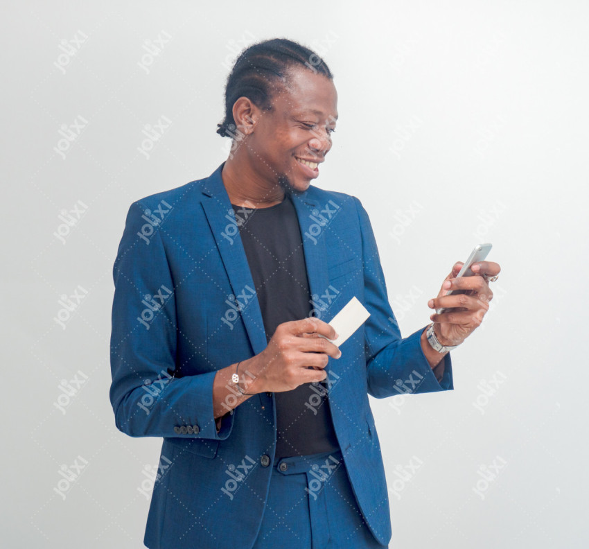 Jeune homme africain content tenant son smartphone et sa carte bancaire sur un fond blanc