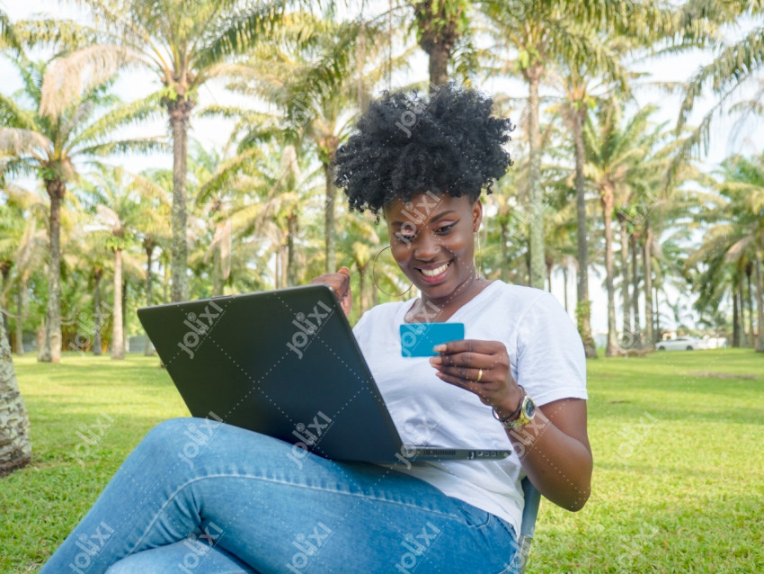 Jeune femme africaine tenant sa carte bancaire assise dans un parc