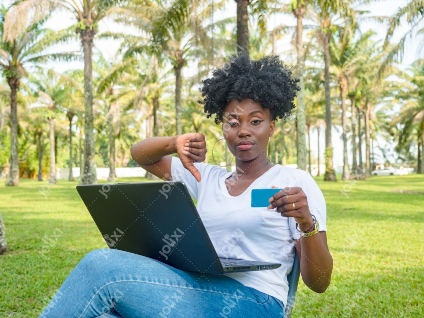 Jeune femme africaine montrant la négativité de sa carte bancaire assise dans un parc