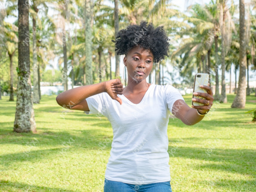 Jeune femme africaine ayant un regard triste tenant un smartphone arrêtée dans un parc