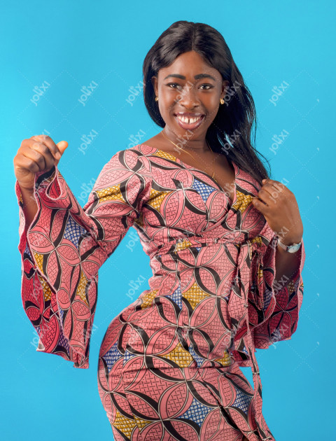 Jeune femme africaine souriante en pagne wax soulevant la manche de son model sur un fond bleu