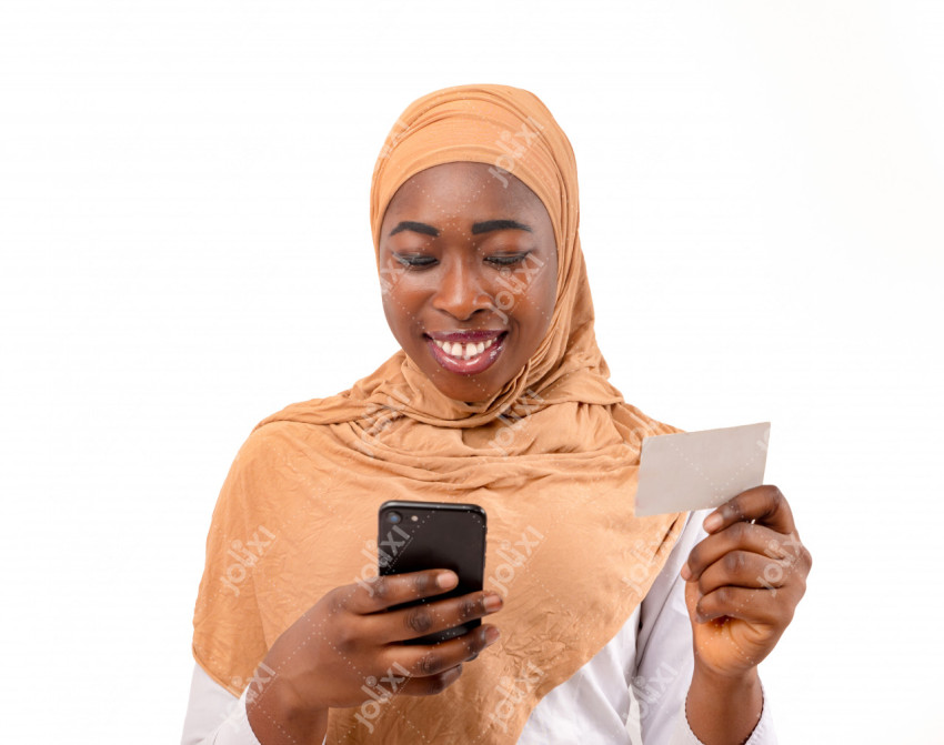 Jeune femme musulmane africaine voilée tenant son smartphone et sa carte bancaire sur un fond blanc