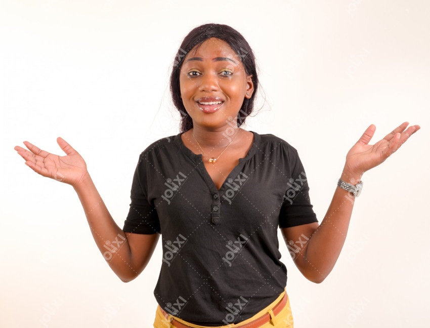 Jeune femme africaine souriante faisant un geste sur un fond gris