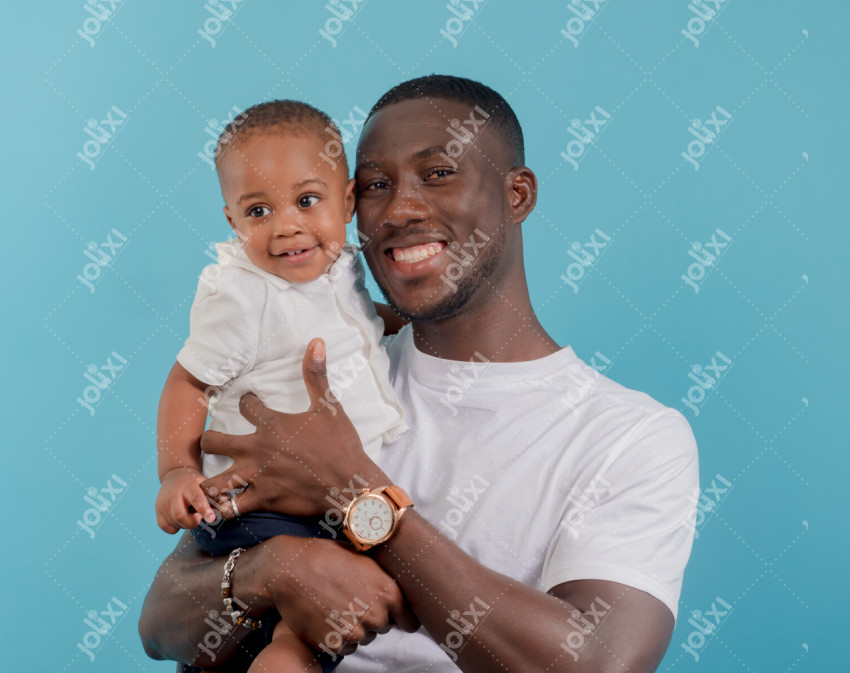 Papa africain souriant posant auprès de son fils sur un fond bleu