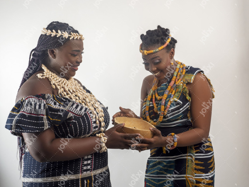 Deux jeunes femmes africaines en joie portant des tenues traditionnels sur un fond beige