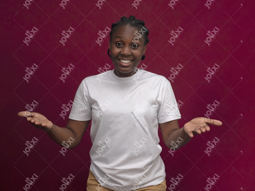 Jeune femme souriante en teeshirt blanc devant fond rouge