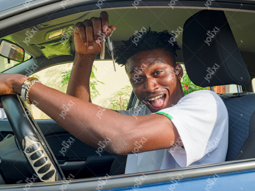 Jeune homme africain souriant assis démarrant sa voiture en plein air avec un chapelet en main