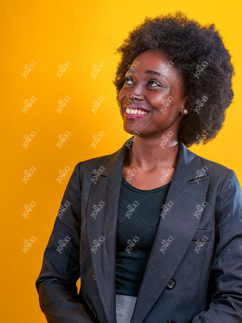 Jeune femme africaine croisant ses bras en veste sur un fond jaune