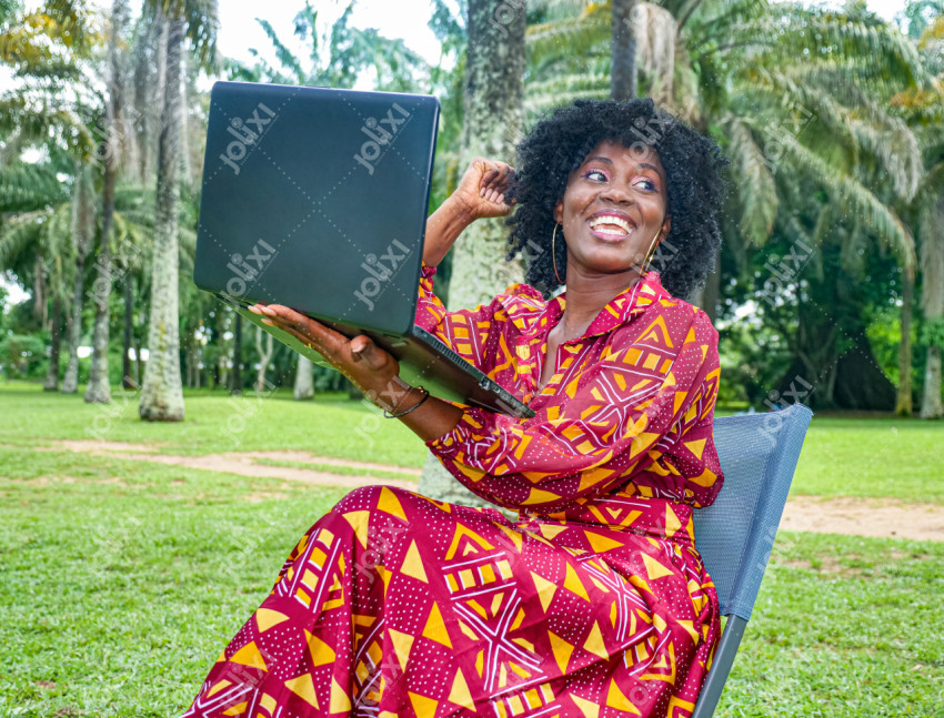 Jeune femme africaine heureuse tenant son ordinateur assise plein air