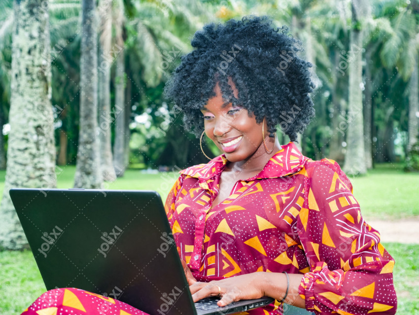 Belle femme africaine en pagne traditionnel regardant son ordinateur