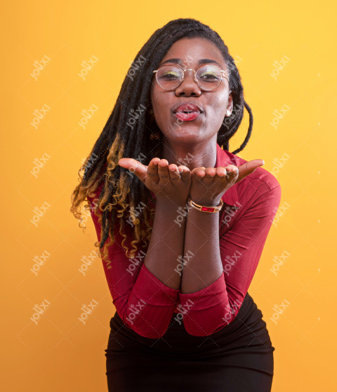 Femme africaine envoyant une bise de loin sur un fond jaune
