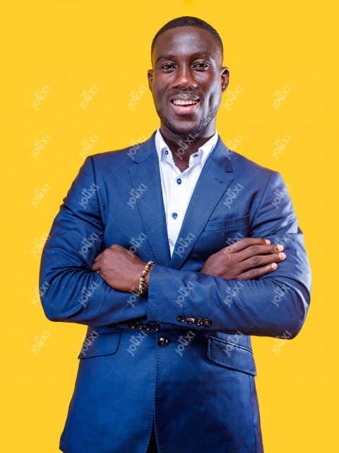 Homme africain avec un léger sourire croisant ses bras sur un fond jaune