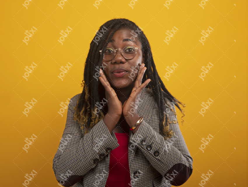 Belle femme africaine ayant un regard étonné sur un fond jaune