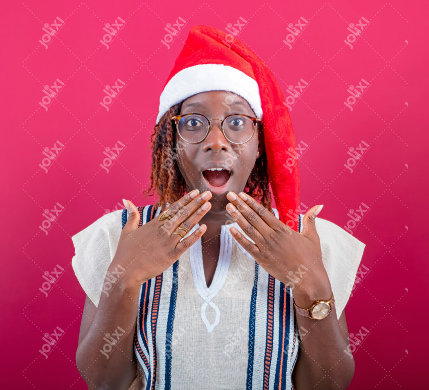 Africaine agréablement surprise et souriante avec chapeau de noël