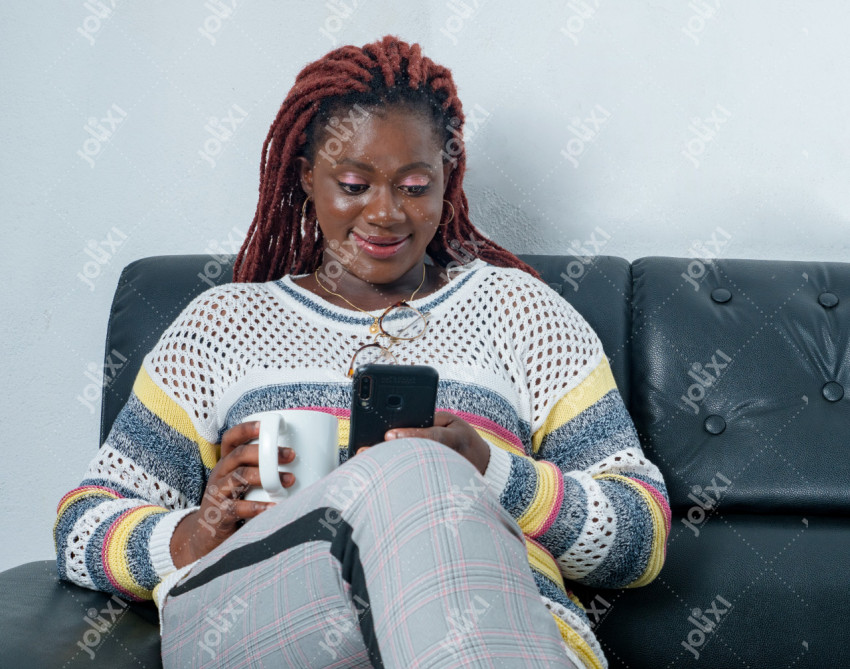 Jeune femme africaine souriante manipulant son smartphone tenant sa tasse assise sur un sofa