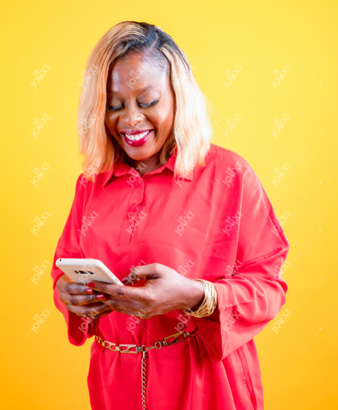 Femme africaine heureuse manipulant son smartphone sur un fond jaune