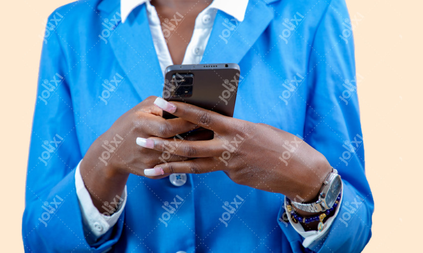 Femme africaine en complet pagne manipulant son téléphone