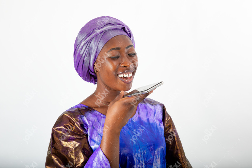 Femme africaine souriante tenant son smartphone en boubou Bazin riche faisant un vocal sur un fond blanc