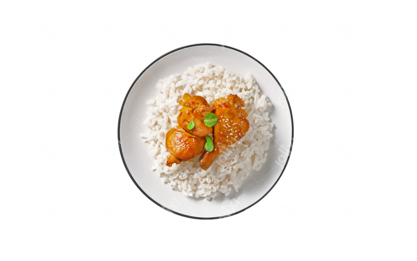 Riz déposé sur une table dans une assiette blanche avec du poulet