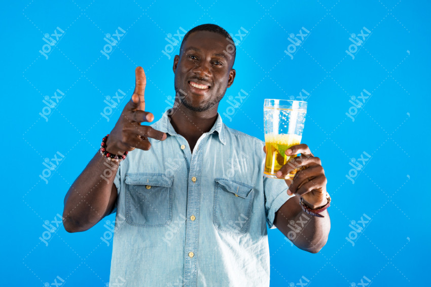 Jeune homme africain souriant tenant une bière sur un fond bleu