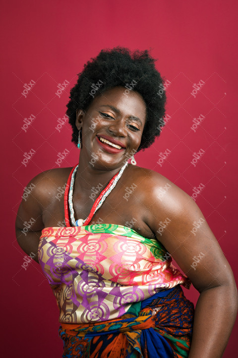 Portrait d'une femme africaine souriante portant une tenue traditionnelle sur un fond rouge