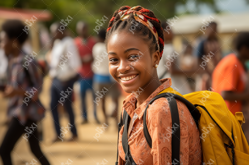 Etudiant africain souriant en tenue scolaire avec son sac à dos avec un arrière plan flou