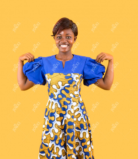 Jeune femme africaine souriante en pagne wax sur un fond jaune