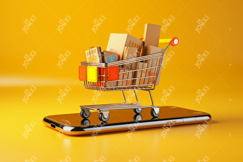 Chariot de course plein sur un téléphone portable sur un fond jaune