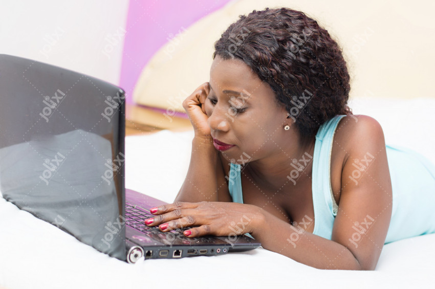 Cette jeune femme est très concentrée sur ses recherches dans sa chambre.