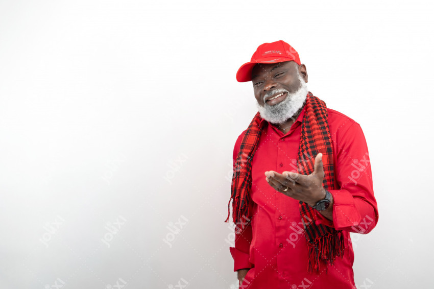 Vieille homme africain souriant en chemise rouge sur un fond blanc