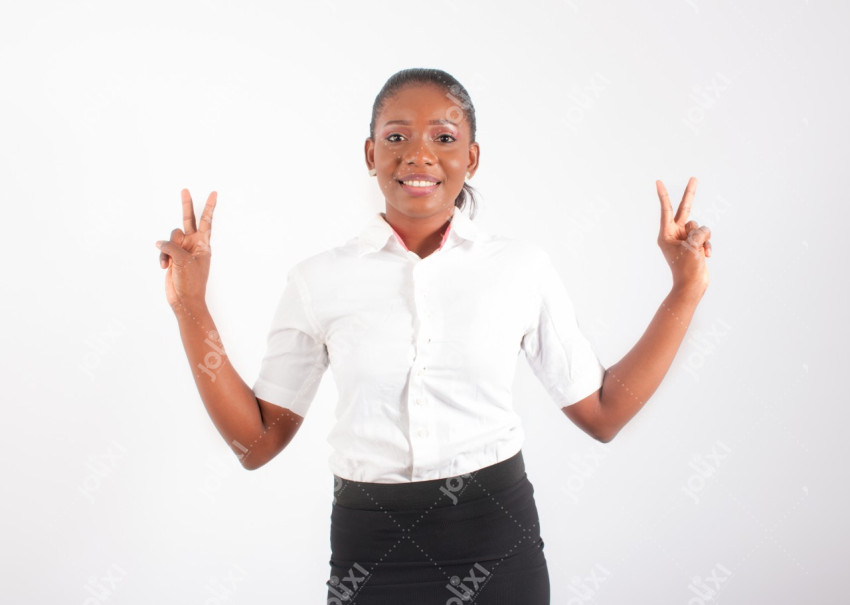Femme africaine souriante en tenue traditionnelle montrant sa paume sur un fond blanc